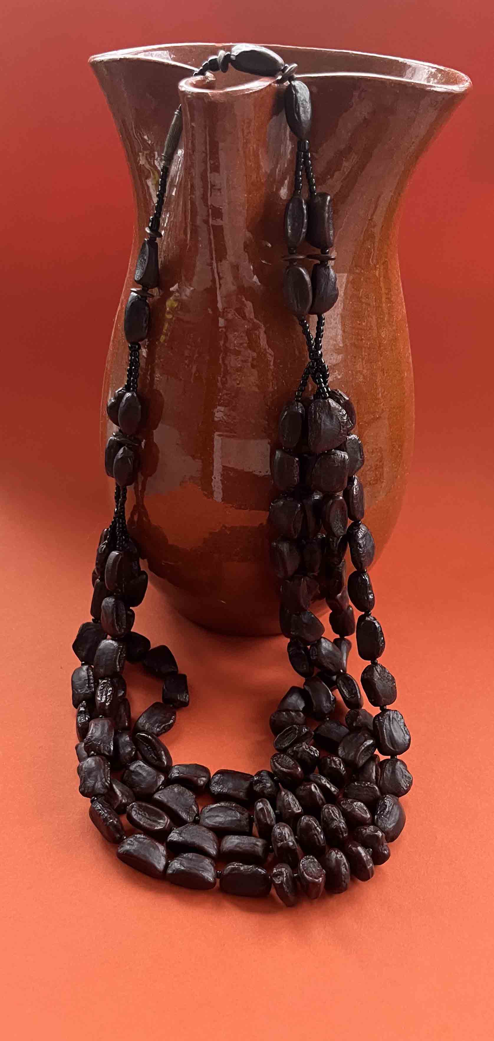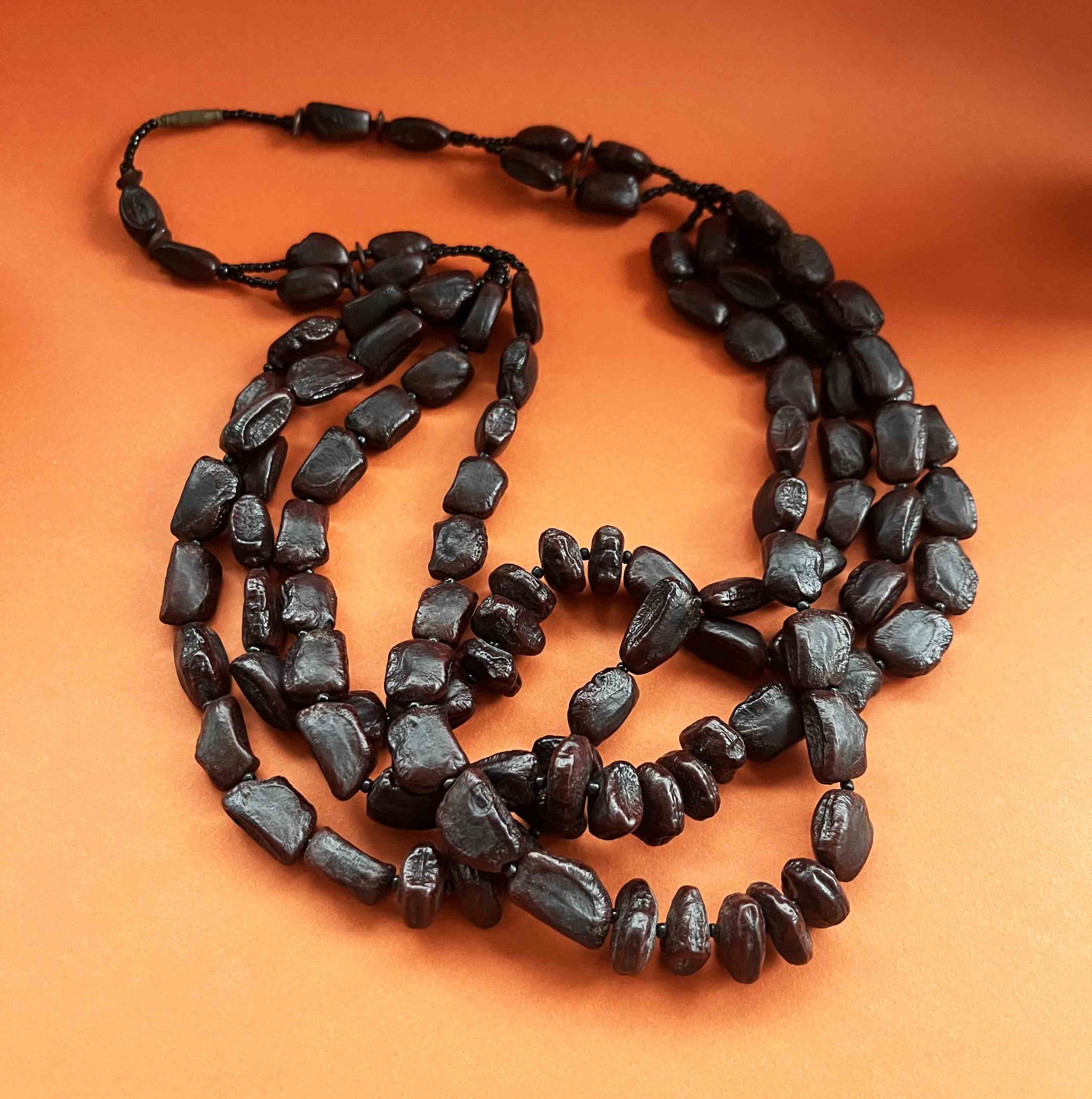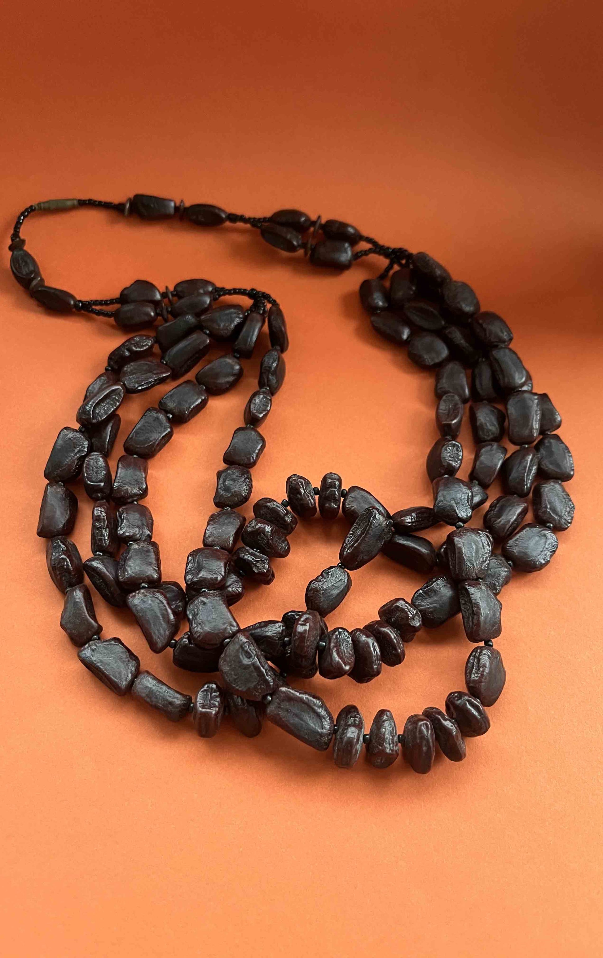Collier long vintage fait de jolies graines sur 4 rangs.